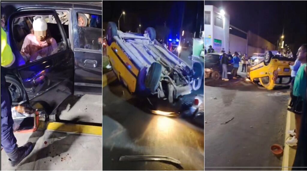 El hecho ocurrió alrededor de las 8:41 p. m., cuando un Chevrolet Spark amarillo de placa C6K-092, que prestaba servicio de transporte público, volcó tras la colisión, quedando con las llantas hacia arriba.