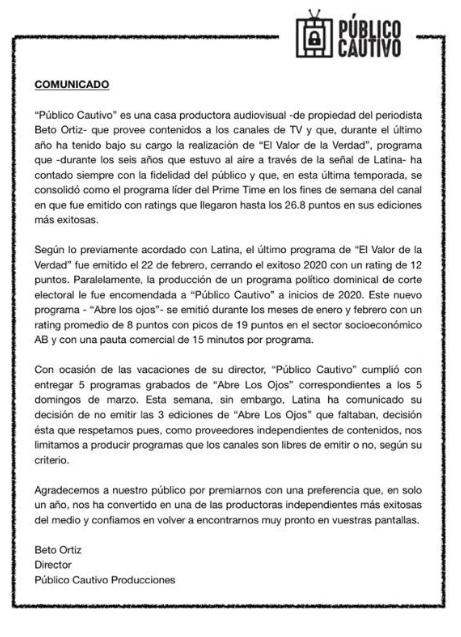 “Con ocasión de las vacaciones de su director, ‘Público Cautivo’ cumplió con entregar 5 programas grabados de ‘Abre Los Ojos’ correspondientes a los 5 domingos de marzo. Esta semana, sin embargo, Latina ha comunicado su decisión de no emitir las 3 ediciones de ‘Abre Los Ojos’ que faltaban", se lee en parte del comunicado.